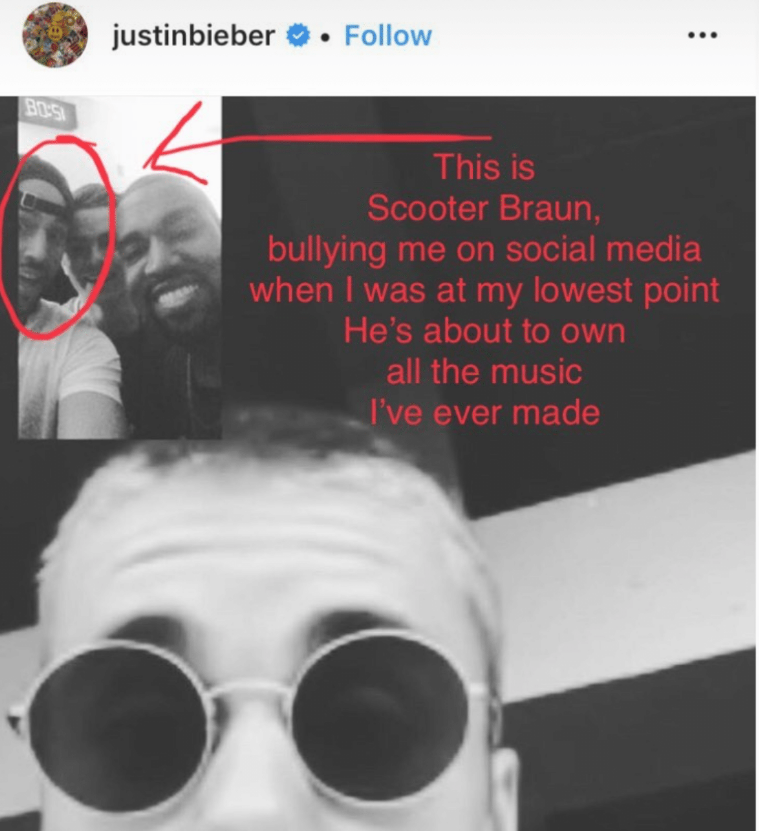 테일러 스위프트는 이 사진을 가리키면서 빨간 글씨로 "이 사람(스쿠터 브라운)이 내가 아주 힘든 시간을 보내고 있을 때, 나를 조롱하고 괴롭히던 스쿠터 브라운이야. 이 사람이 지금 내 음악 판권들을 모조리 앗아가려 하고 있어."하며 힘든 심정을 나타냈습니다.